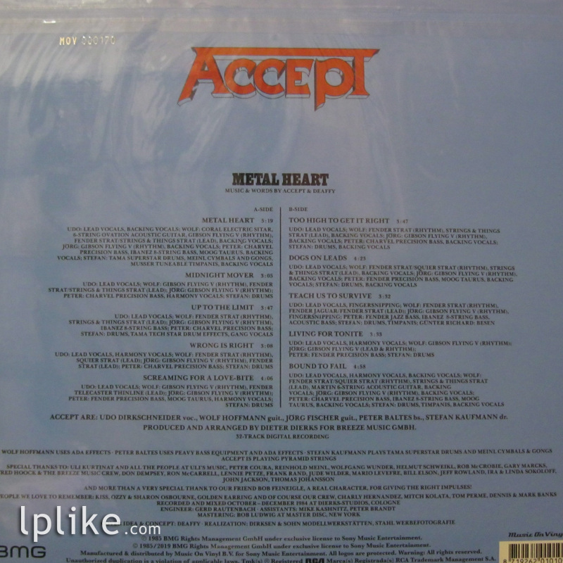 Приобрести грампластинку Accept - Metal Heart (LP, Европа) в состоянии Sealed(конверт)/Sealed(винил) можно через сайт нашего интернет-магазина с доставкой по всей России и СНГ. Альбом «Metal Heart» выпущен лейблом Music On Vinyl / BMG / RCA, год издания пластинки 2019, производство Europe (Европа). В него вошли такие песни как: «Wrong Is Right», «Midnight Mover», «Living For Tonite» и другие.